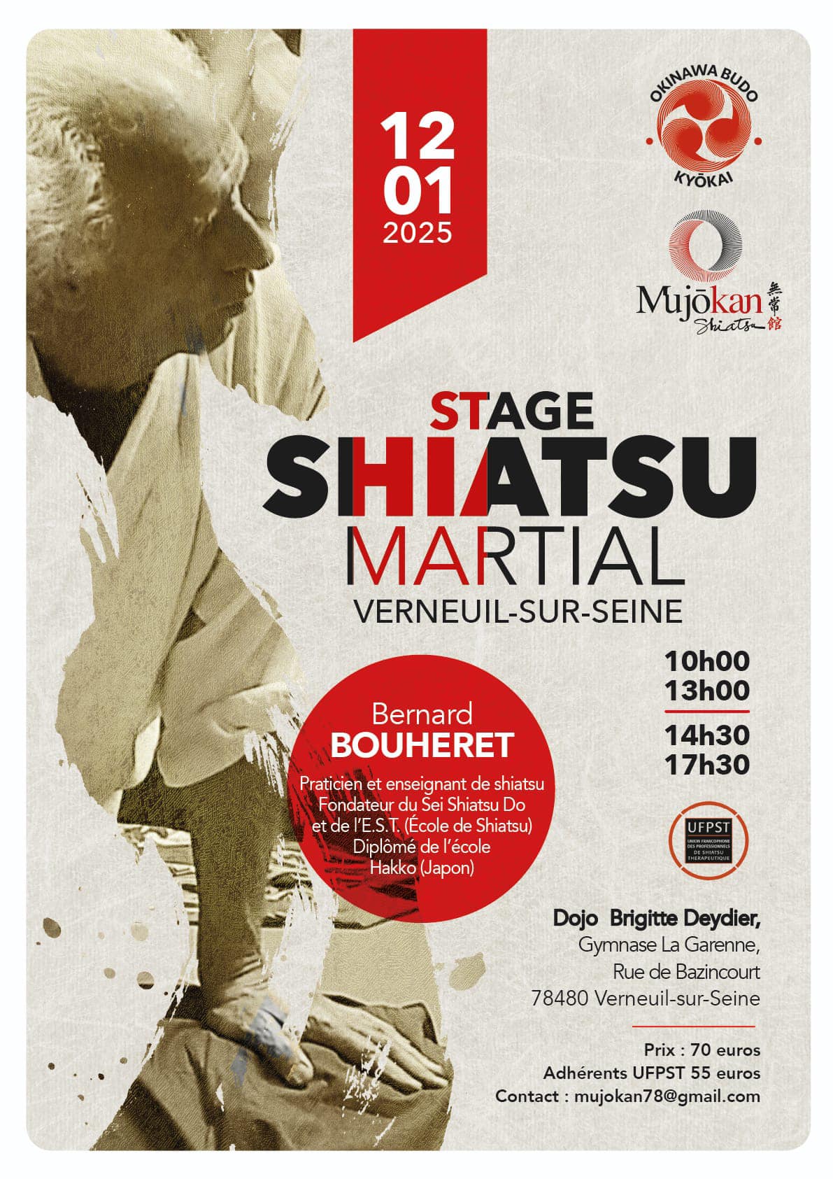 Notre association, en partenariat avec Mujōkan – Association Shiatsu a le plaisir de recevoir Bernard Bouheret pour un stage de Shiatsu Martial, le dimanche 12 janvier à Verneuil-sur-Seine dans les Yvelines. Bernard n’est plus à présenter, kinésithérapeute de formation, enseignant de shiatsu depuis 1987, fondateur de l’école E.S.T et de l’UFPST, diplômé de l’école Hakko […]