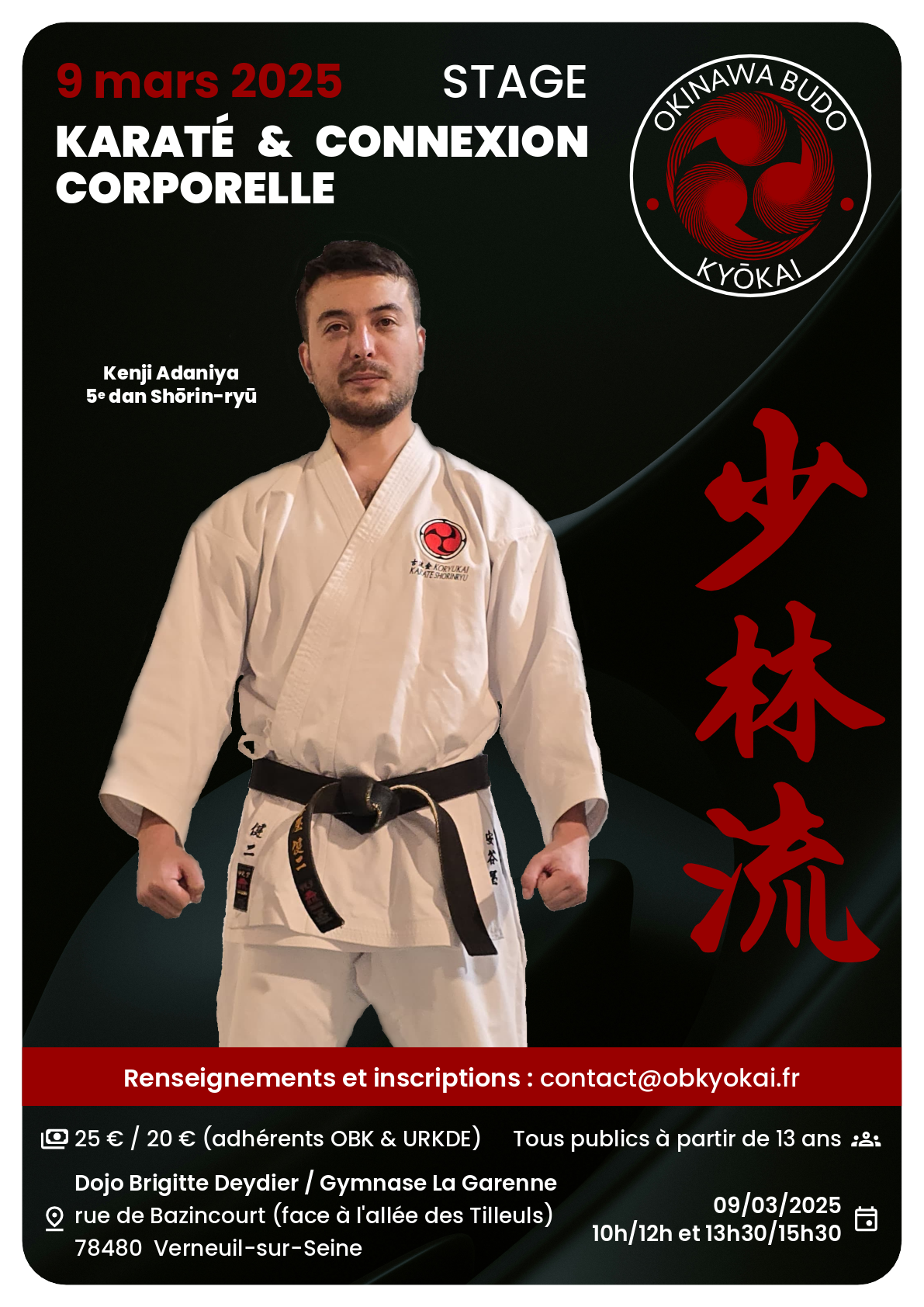 Nous aurons le plaisir de recevoir Kenji Adaniya le dimanche 9 mars ! Une journée de stage où il nous fera découvrir le travail de la connexion corporelle dans le karaté. Vous pouvez vous inscrire via ce lien : https://forms.gle/WAHb13JTR1DE7hAz5 On vous attends nombreux pour découvrir cette pratique !